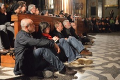 In ginocchio intorno alla tavola, lavando i piedi dei discepoli. È l’immagine di Gesù all’ultima cena descritta dall’evangelista Giovanni. Segno di un modo di esercitare il potere e l’autorità che provoca e critica gli atteggiamenti umani, segnati da una ricerca di sé chiamata a convertirsi in servizio concreto, dettato dall’amore.