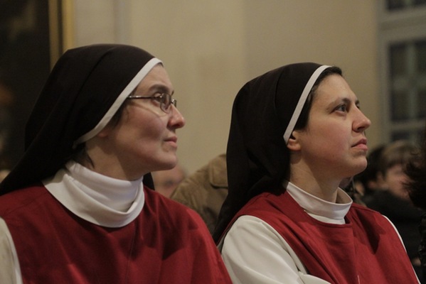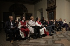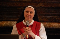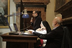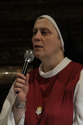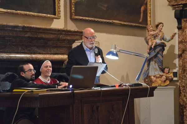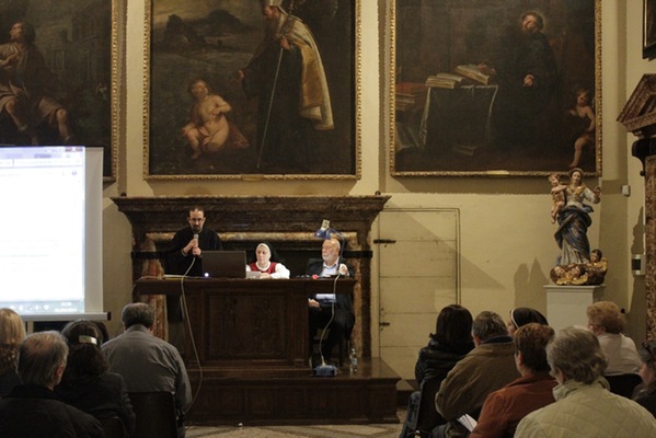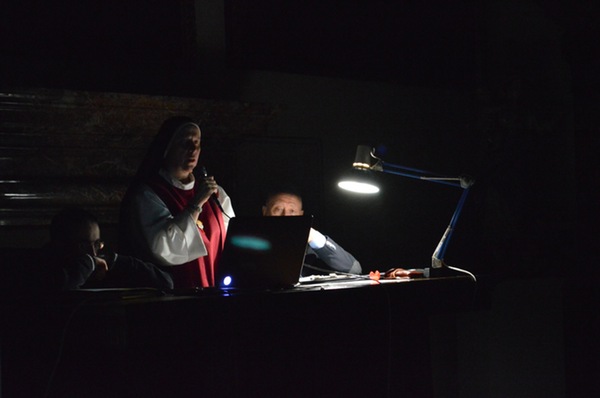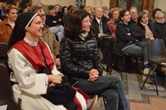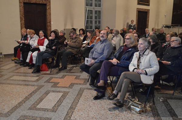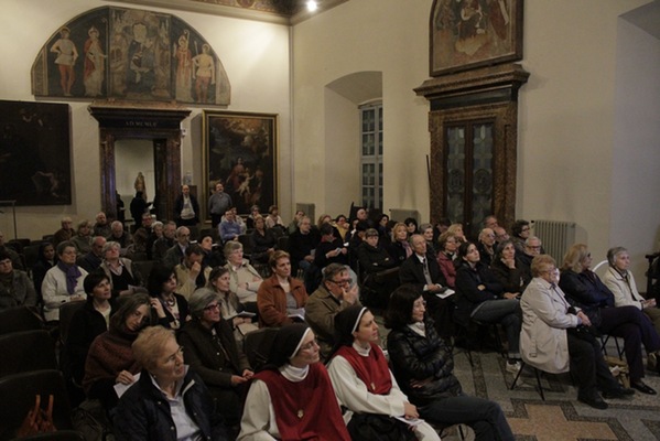 «Una salita al Calvario dipinta con le immagini dell’oggi». Così suor Maria Gloria Riva, fondatrice del monastero delle adoratrici perpetue del Santissimo Sacramento di Pietrarubbia, ha definito l’opera “Via Crucis per il terzo millennio”, del pittore polacco Jerzy Duda Gracz, nell’incontro di “Passio” di martedì 1 aprile nella sala Maddalena del Palazzo dei Vescovi. «Siamo nella vigilia del giorno in cui, nove anni fa, moriva il beato Giovanni Paolo II – ha ricordato Pietro Toscani, presidente de La Nuova Regaldi e organizzatore dell’incontro, insieme con Luciana Graceffo e Laura Ganzerla –. Ed è proprio grazie all’incontro con questo papa, nel suo primo viaggio in terra polacca, che l’autore si è convertito alla fede cristiana». Una terra sempre presente nei dipinti della Via Crucis di Gracz, attraverso i personaggi che vi sono ritratti e i simboli della sua storia recente. Così lo stesso Giovanni Paolo II, padre Popiełuszko – ucciso dal regime comunista negli anni ’80 – e Massimiliano Kolbe – martire ad Auschwitz – compaiono nelle tele, e i pali stessi dei reticolati del campo di concentramento formano il letto su cui il Cristo viene deposto dopo la morte. «Gesù cammina con il popolo di Polonia – spiega suor Maria Gloria –, ma in questi quadri i suoi piedi non si vedono mai. Si mescolano con i nostri, sono i piedi che camminano con noi e che sostengono il peso stesso del mondo». I dipinti si fanno denuncia di una società e di una Chiesa che troppo spesso è connivente con il potere, e che diviene cieca e incapace di farsi voce dei deboli. E sono loro – bambini, anziani, una prostituta – che dai quadri volgono lo sguardo agli spettatori, chiamandoli a condividere il loro dramma. «I piedi di Cristo compaiono infine nella crocifissione, enormi e in primo piano, come i piedi che hanno percorso un cammino di millenni», spiega suor Maria Gloria. È l’ultimo, doloroso episodio di una storia che si apre ai colori della speranza con le scene della Risurrezione e dell’Ascensione, evocate dalle parole di Giovanni Paolo II, lette da Bob Rattazzi, allenatore di basket impegnato nell’integrazione tra ragazzi portatori di handicap e normodotati, e protagonista della serata insieme con suor Maria Gloria: in esse «Gesù mostra che l’umanità alla fine della vita non è votata alla all’immersione nell’oscurità, al vuoto esistenziale dissoluzione e alla voragine del nulla, ma è votata all’incontro con il Padre».