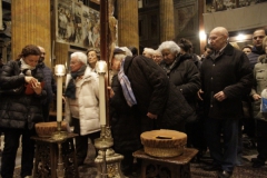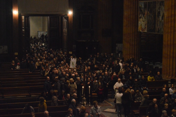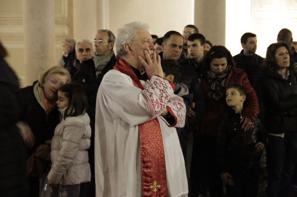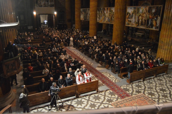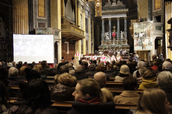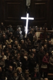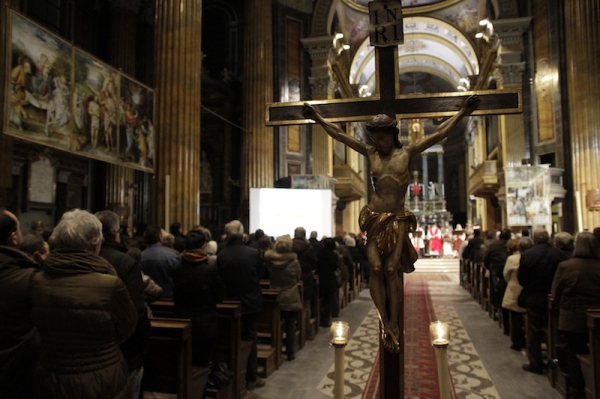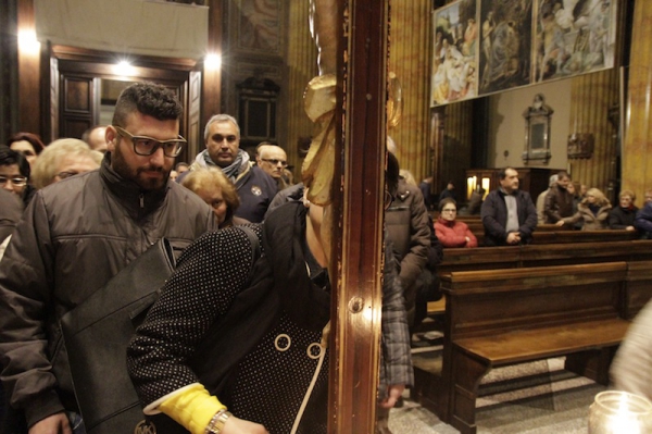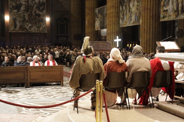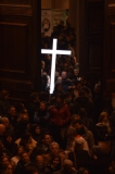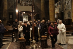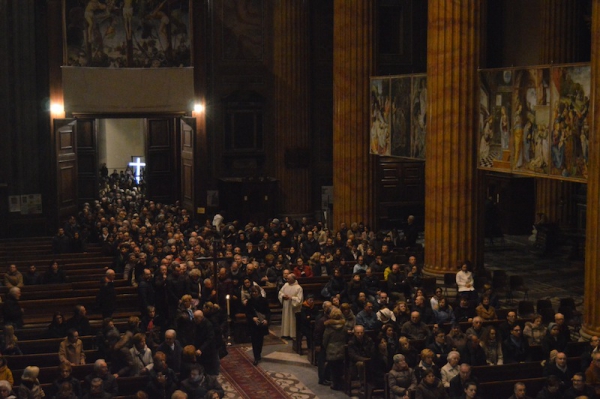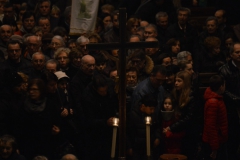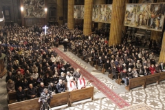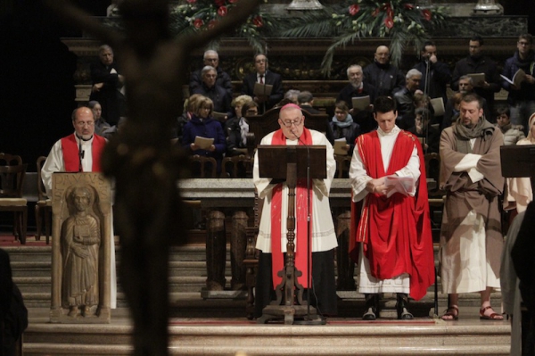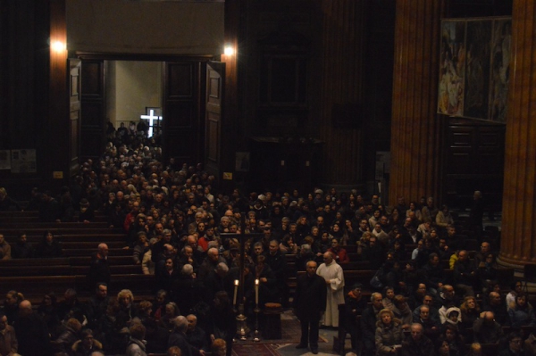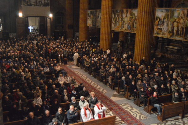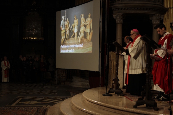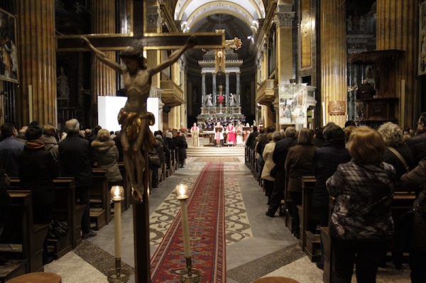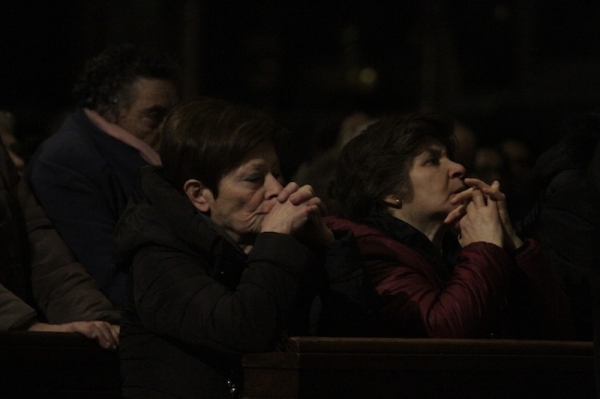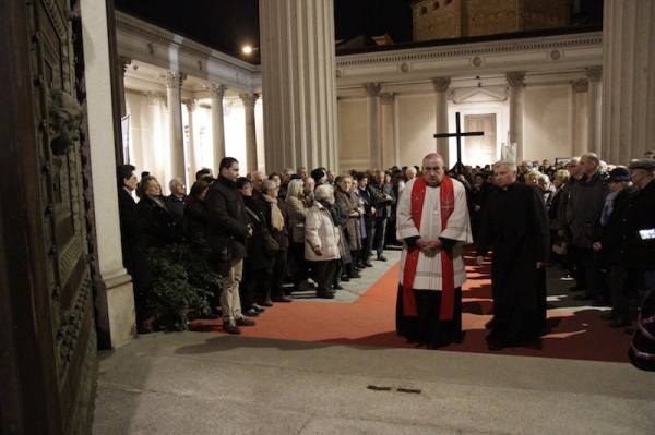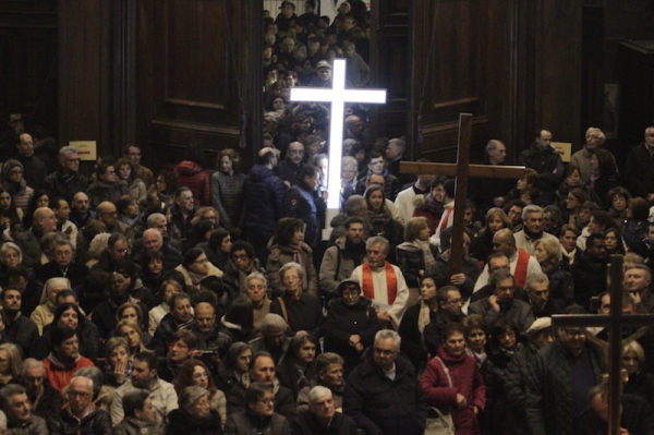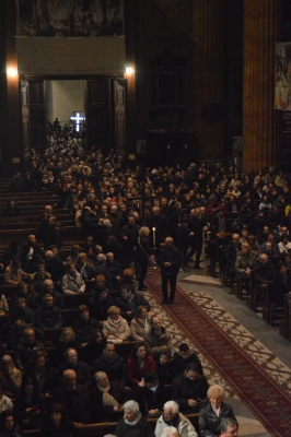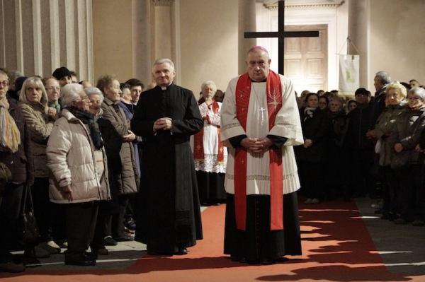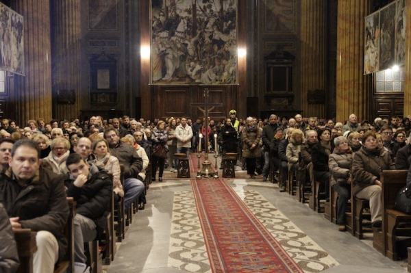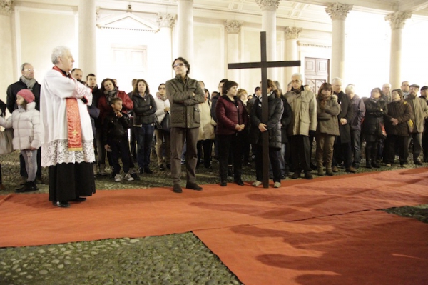 «Dunque tu sei re?». La domanda che Ponzio Pilato rivolge a Gesù nel corso del processo che porta alla sua condanna è il centro della riflessione che mons. Franco Giulio Brambilla offre al pubblico riunito nella Cattedrale di Novara nella celebrazione cittadina della sera di venerdì santo 25 marzo. È il punto di arrivo di un pellegrinaggio che chiama le parrocchie di Novara a convergere verso il Duomo per celebrare, nell’Anno giubilare, il mistero della misericordia di Dio nell’offerta di sé che Gesù compie sulla croce. I fedeli giungono così a piedi, in cammini processionali partiti dalla rispettive chiese parrocchiali (San Martino, Madonna Pellegrina, San Giuseppe, Centro Città, Torrione, San Francesco e Sacra Famiglia) o da punti di ritrovo ai margini del centro cittadino (parrocchie di Sant’Agabio, Veveri, Sant’Antonio, Sant’Andrea, san Rocco, Santa Rita, Bicocca e Vignale), radunandosi nel quadriportico della Cattedrale. Ad attenderli è il Vescovo, che per primo varca la Porta Santa. L’incontro con il Cristo ha quindi inizio con la venerazione del Crocifisso, esposto nella navata centrale, cui i pellegrini si accostano con baci e gesti di affetto, accompagnati dal canto del coro della comunità novarese di Comunione e Liberazione e della lettura di brani della Misericordiæ Vultus di papa Francesco. Segue la lettura della Passione secondo San Giovanni, cui prendono parte gli attori del Venerdì Santo di Romagnano Sesia e il popolo stesso, chiamato a interpretare le parti di sacerdoti e soldati perché – ricorda don Silvio Barbaglia – «Gesù è morto per salvarci dai nostri peccati ma anche a causa di essi, e desideriamo chiedere il suo perdono». Il testo evangelico, intervallato dai canti del coro delle celebrazioni della vescovili, è commentato da immagini d’arte del Sacro Monte di Varallo, della Madonna delle Grazie di Varallo e dei gruppi statuari della Passione custoditi ai musei diocesani. «Gesù è presentato al popolo come re, percosso e incoronato per burla con delle spine – conclude il Vescovo –. La sua regalità si esprime nell’essere servo, e signore dei nostri cuori, per portarci a Dio e agli altri uomini, perché anch’essi si salvino. Egli è venuto a salvare ogni uomo, senza dimenticare il discepolo “nascosto” e il discepolo “notturno” che ci abitano: Giuseppe di Arimatea e Nicodemo. Proprio a loro, rappresentanti della parte di noi più restia a mostrarsi “in piazza” e venire alla luce, viene affidato il compito di accogliere il corpo di Gesù, deposto dalla croce».