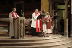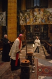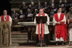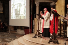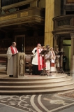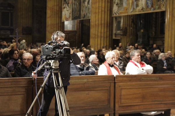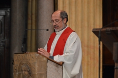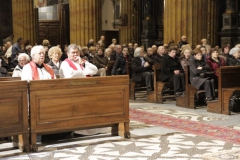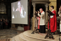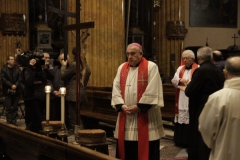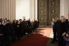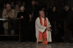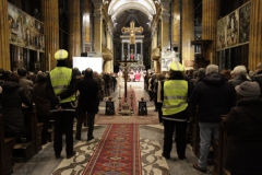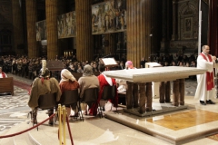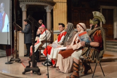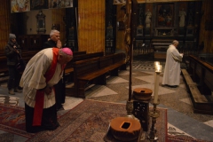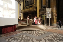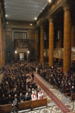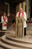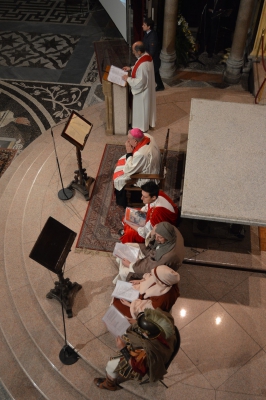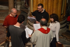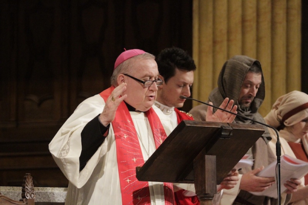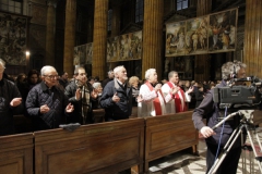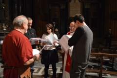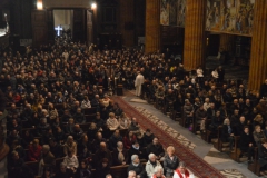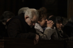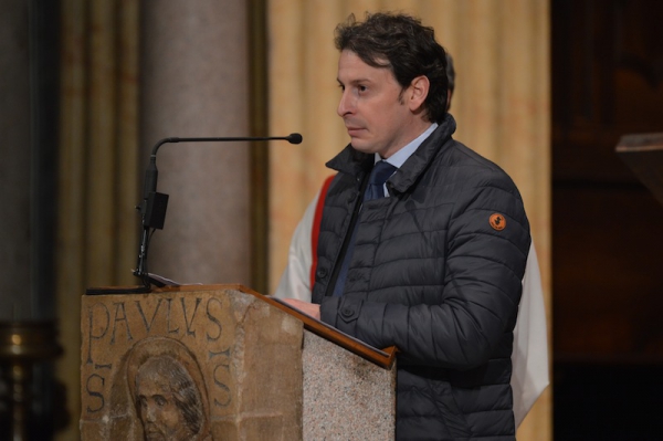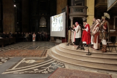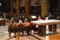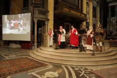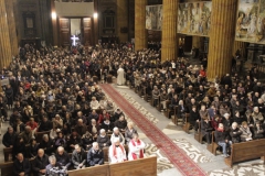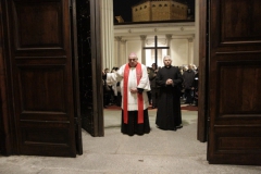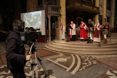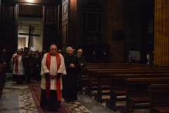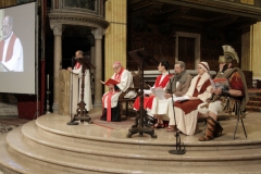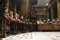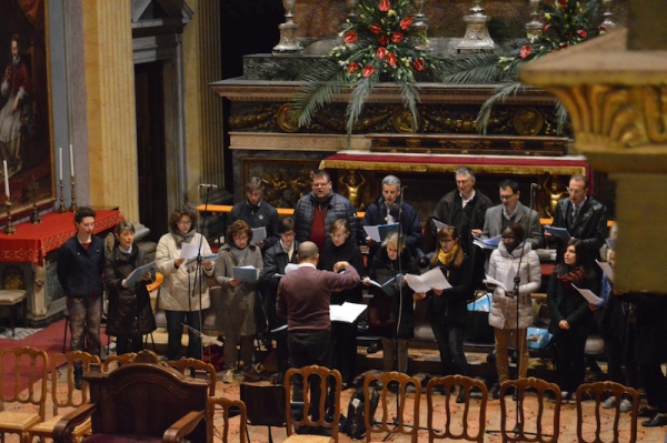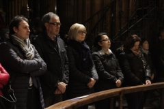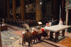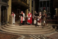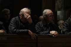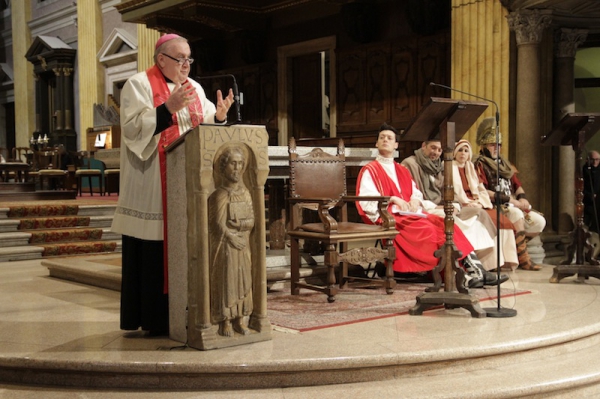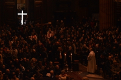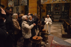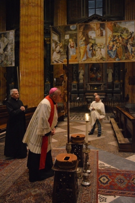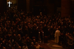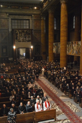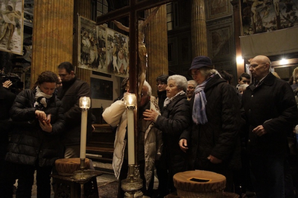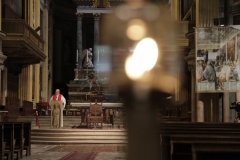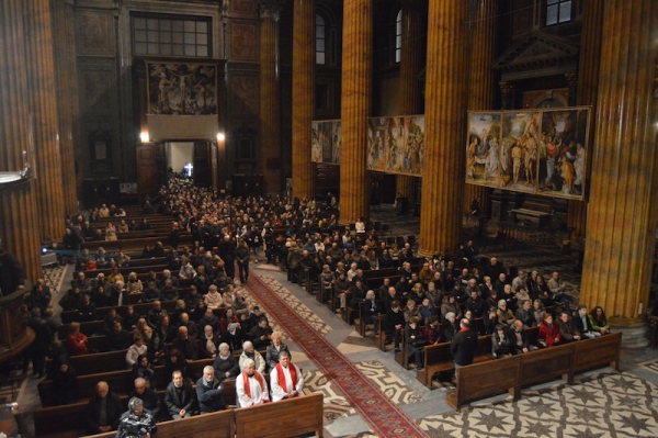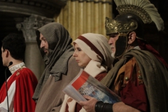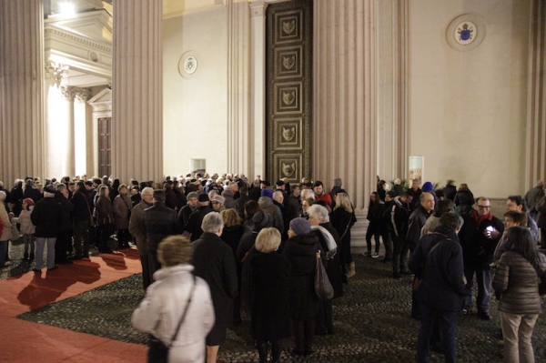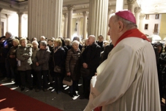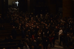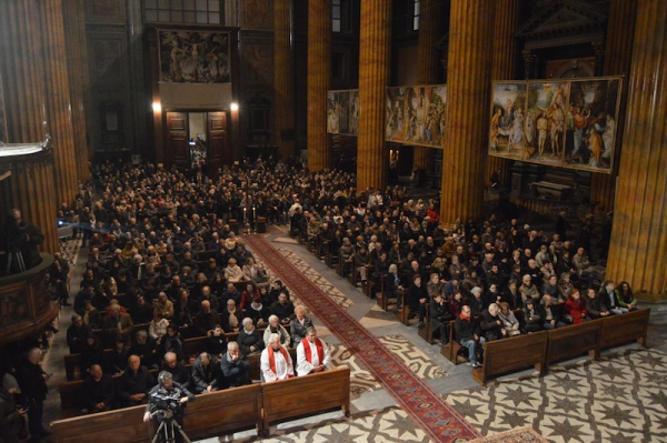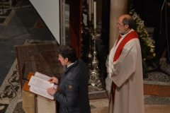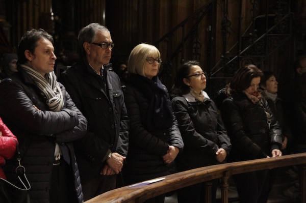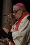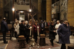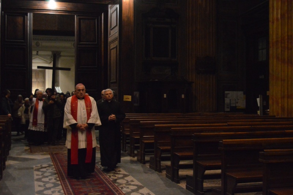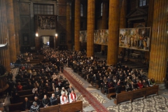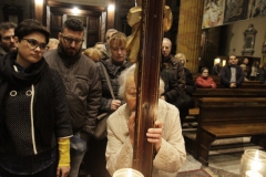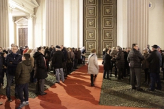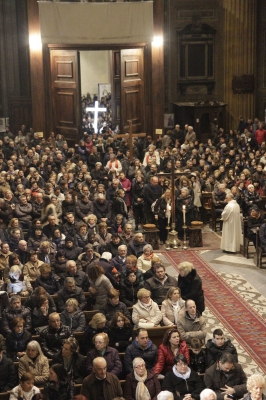 «Dunque tu sei re?». La domanda che Ponzio Pilato rivolge a Gesù nel corso del processo che porta alla sua condanna è il centro della riflessione che mons. Franco Giulio Brambilla offre al pubblico riunito nella Cattedrale di Novara nella celebrazione cittadina della sera di venerdì santo 25 marzo. È il punto di arrivo di un pellegrinaggio che chiama le parrocchie di Novara a convergere verso il Duomo per celebrare, nell’Anno giubilare, il mistero della misericordia di Dio nell’offerta di sé che Gesù compie sulla croce. I fedeli giungono così a piedi, in cammini processionali partiti dalla rispettive chiese parrocchiali (San Martino, Madonna Pellegrina, San Giuseppe, Centro Città, Torrione, San Francesco e Sacra Famiglia) o da punti di ritrovo ai margini del centro cittadino (parrocchie di Sant’Agabio, Veveri, Sant’Antonio, Sant’Andrea, san Rocco, Santa Rita, Bicocca e Vignale), radunandosi nel quadriportico della Cattedrale. Ad attenderli è il Vescovo, che per primo varca la Porta Santa. L’incontro con il Cristo ha quindi inizio con la venerazione del Crocifisso, esposto nella navata centrale, cui i pellegrini si accostano con baci e gesti di affetto, accompagnati dal canto del coro della comunità novarese di Comunione e Liberazione e della lettura di brani della Misericordiæ Vultus di papa Francesco. Segue la lettura della Passione secondo San Giovanni, cui prendono parte gli attori del Venerdì Santo di Romagnano Sesia e il popolo stesso, chiamato a interpretare le parti di sacerdoti e soldati perché – ricorda don Silvio Barbaglia – «Gesù è morto per salvarci dai nostri peccati ma anche a causa di essi, e desideriamo chiedere il suo perdono». Il testo evangelico, intervallato dai canti del coro delle celebrazioni della vescovili, è commentato da immagini d’arte del Sacro Monte di Varallo, della Madonna delle Grazie di Varallo e dei gruppi statuari della Passione custoditi ai musei diocesani. «Gesù è presentato al popolo come re, percosso e incoronato per burla con delle spine – conclude il Vescovo –. La sua regalità si esprime nell’essere servo, e signore dei nostri cuori, per portarci a Dio e agli altri uomini, perché anch’essi si salvino. Egli è venuto a salvare ogni uomo, senza dimenticare il discepolo “nascosto” e il discepolo “notturno” che ci abitano: Giuseppe di Arimatea e Nicodemo. Proprio a loro, rappresentanti della parte di noi più restia a mostrarsi “in piazza” e venire alla luce, viene affidato il compito di accogliere il corpo di Gesù, deposto dalla croce».